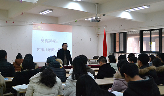 代祥社副书记讲话,他首先向预备党员们表示欢迎和祝贺,并对预备党员们提出更高的要求和殷切的希望,鼓励大家积极参与国内各高校间的交流互动,希望同学们多在各类期刊杂志上发表文章,为贵州大学一流学科与一流高校的建设贡献自己的一份力量,为新贵大的建设添砖加瓦,勉励大家成为一名新时代的合格党员。