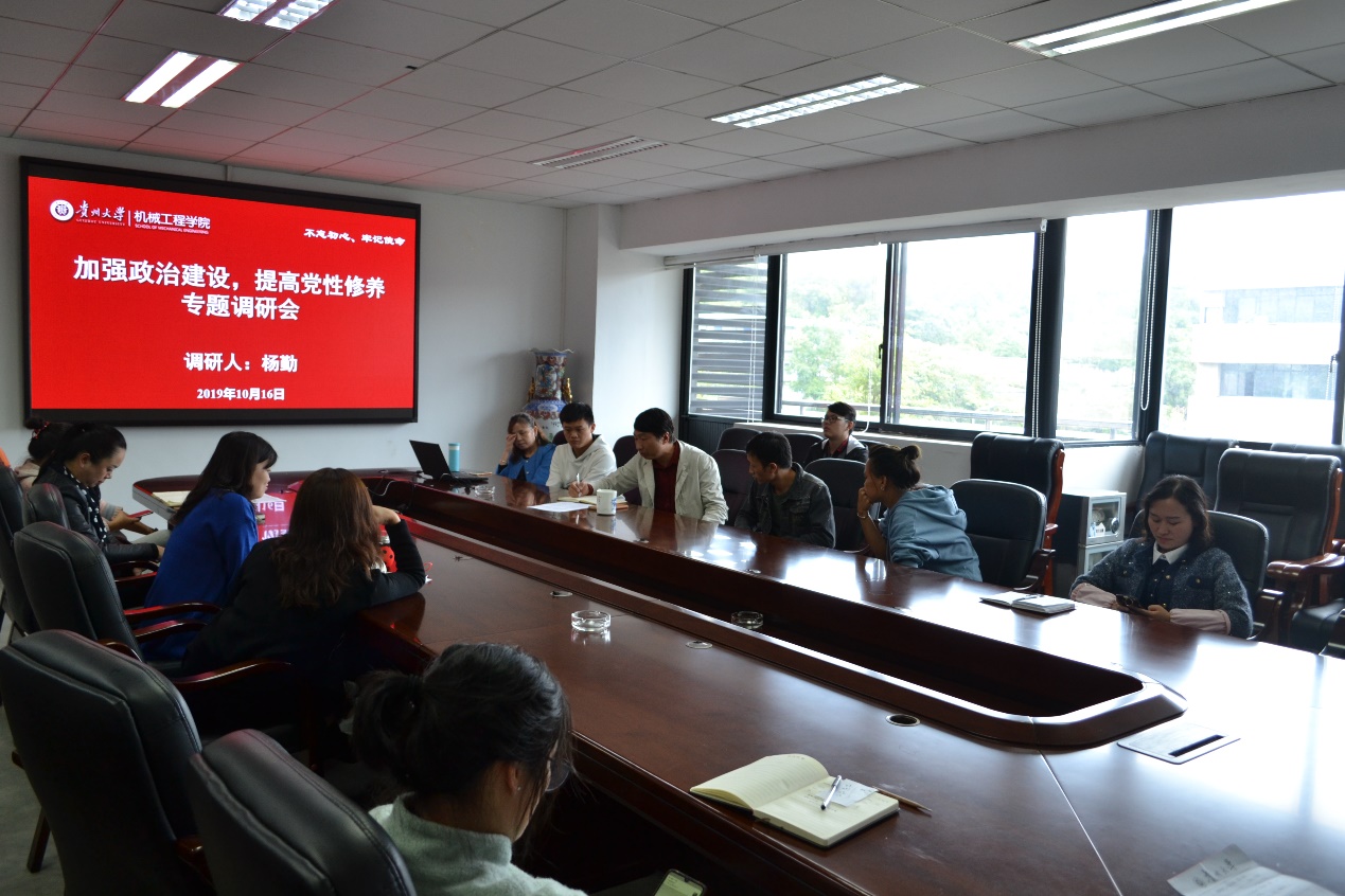 (记者 范顺鑫|摄影 范顺鑫 )为认真落实中央、省委和贵州大学党委的决策部署,扎实开展学院“不忘初心、牢记使命”主题教育工作,根据博中bz会员登录党委班子成员开展主题教育调研方案,10月16日,博中bz会员登录副院长杨勤在机械楼518会议室召开“加强政治建设,提高党性修养”专题调研会,学院党委副书记代祥社及各支部书记、学生党员代表、教职工党员代表参加了会议。