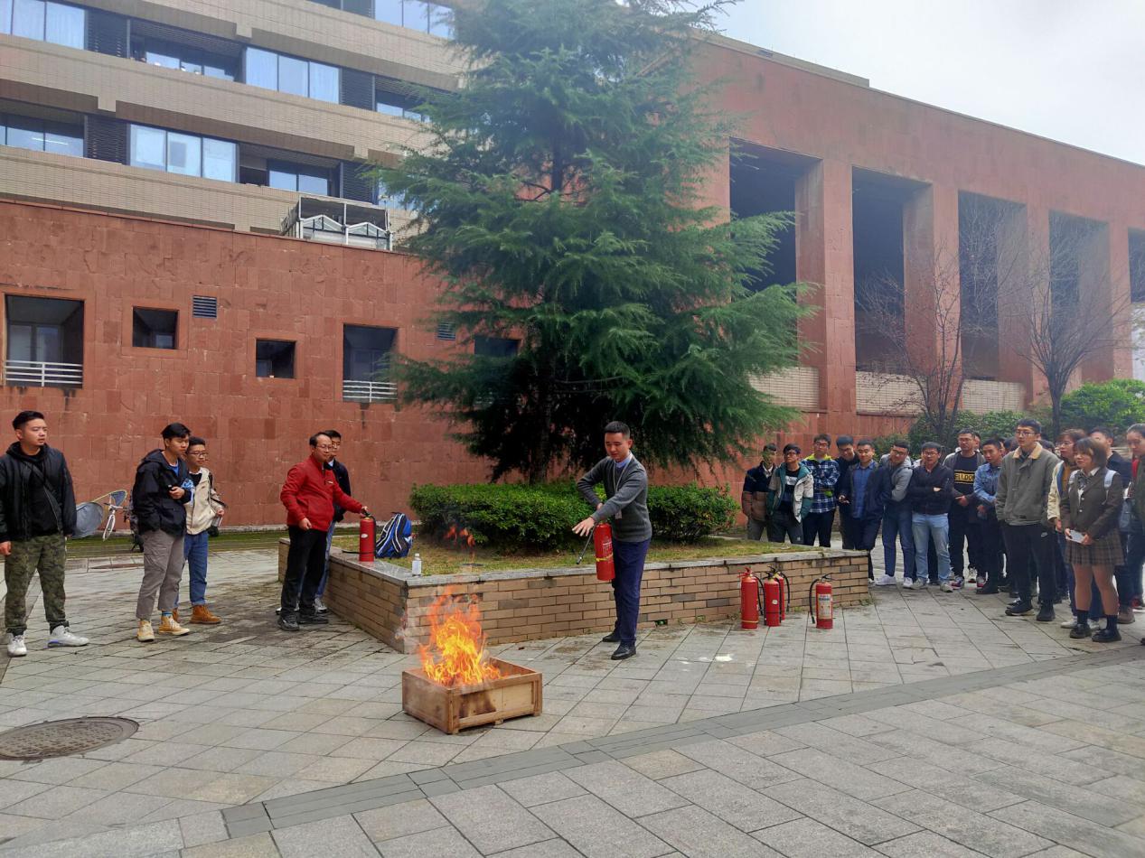 宣讲会结束以后,在学院楼下的空旷处,进行消防实训演习。艾老师一个步骤一个步骤的教老师和同学们如何正确使用灭火器。随后,还让老师、同学们实践操作,让他们真正的学会使用灭火器灭火。大家也积极参加,现场氛围热烈。