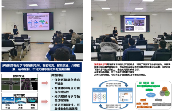 在此次报告中,张亚教授介绍了多智能体强化学习及在智能无人系统应用的研究背景,清晰解释了深度强化学习的目的和意义,将集成学习与深度逆向强化学习相结合构建了集成逆向强化学习模型,提出了多智能体模仿强化学习算法,消除智能体局部观测带来的累积误差,建立人在回路的多智能体安全强化学习算法,提高了多智能体学习协作策略的效率,设计了基于人类专家偏好奖励的强化学习算法等,并展示了在智能电网、智能物流、智能交通、兵棋推演、运动控制、市场交易等领域的重要应用。