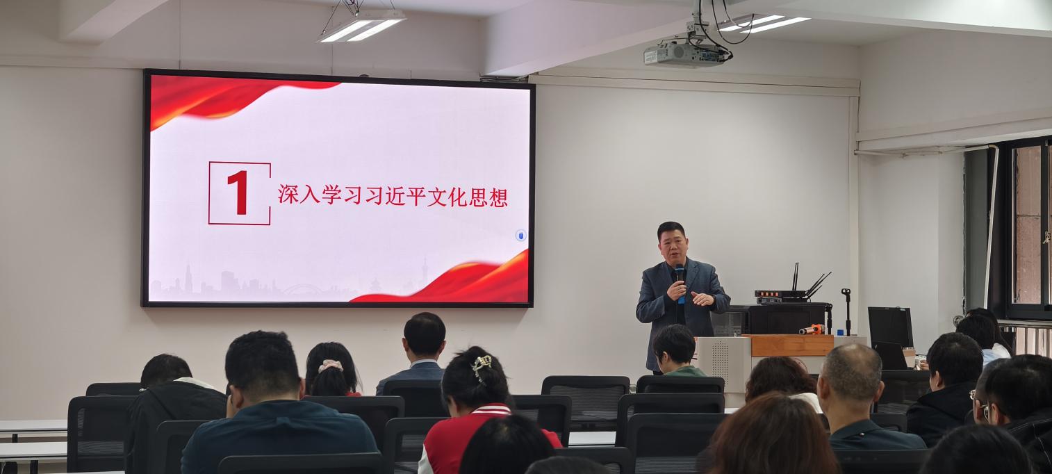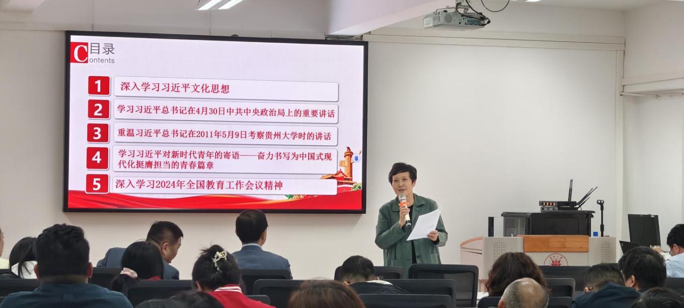 党委书记滕召华带领全体教职工深入学习习近平文化思想,董蔚然书记领学习近平总书记在4月30日中共中央政治局上的重要讲话、重温习近平总书记在2011年5月9日考察贵州大学时的讲话、习近平总书记对新时代青年的寄语——奋力书写为中国式现代化挺膺担当的青春篇章,随后深入学习2024年全国教育工作会议精神。